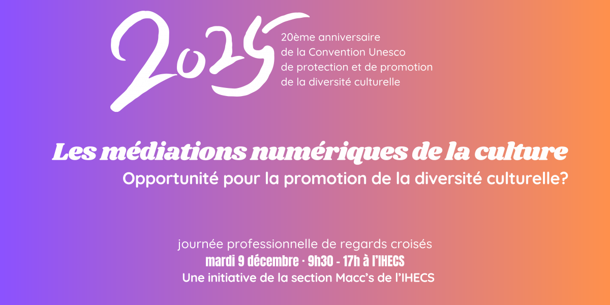 À la veille de la journée mondiale des droits humains, rejoignez-nous le mardi 9 décembre à l’IHECS pour une journée ouverte à la profession, placée sous le signe du dialogue interdisciplinaire et de l’entrepreneuriat culturel. La journée sera introduite par Mr. Martin Ouaklani, diplomate Wallonie-Bruxelles à Paris, référent UNESCO. Un rendez-vous à ne pas manquer pour imaginer ensemble un avenir où la technologie devient un allié de la diversité culturelle.